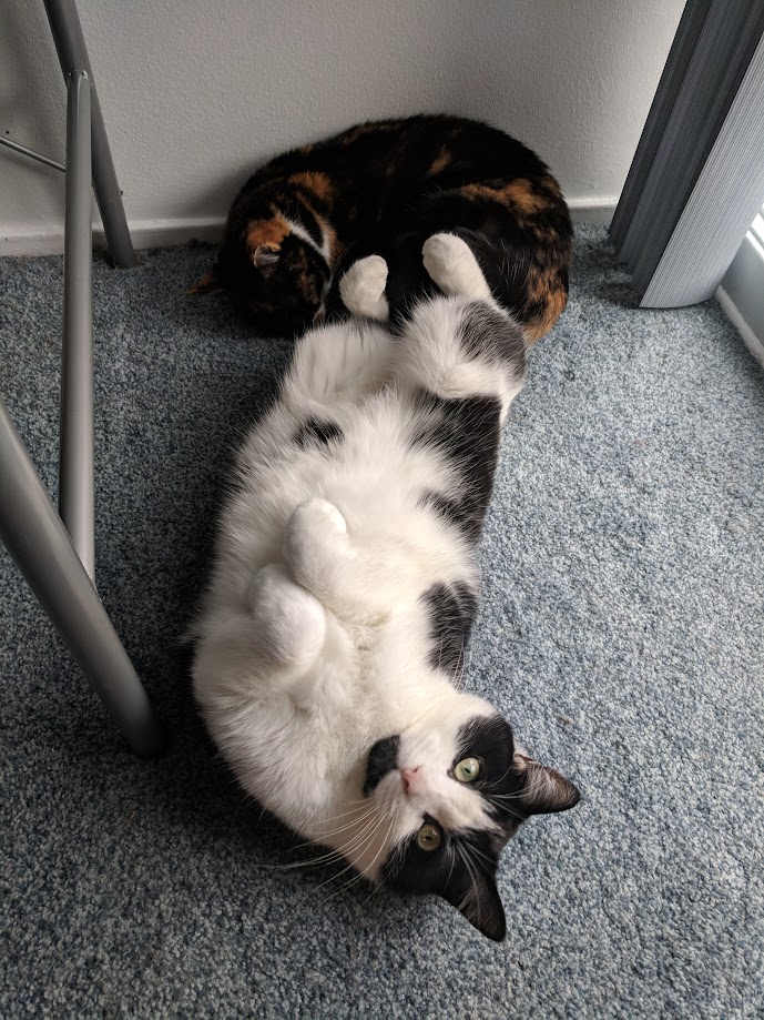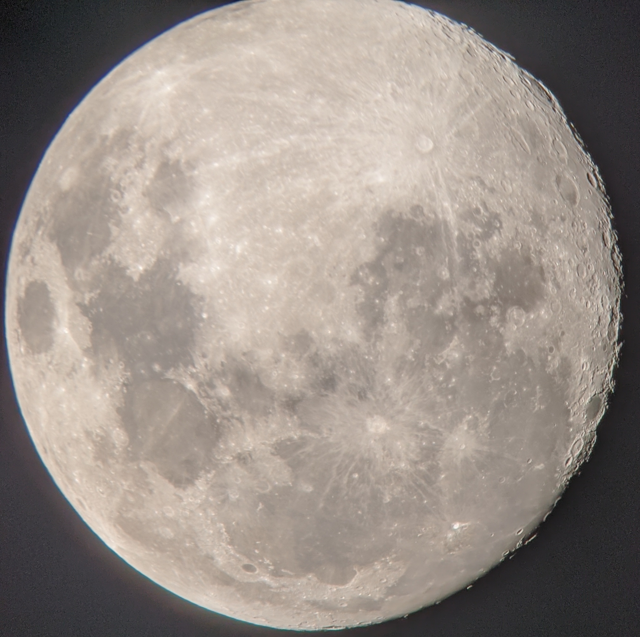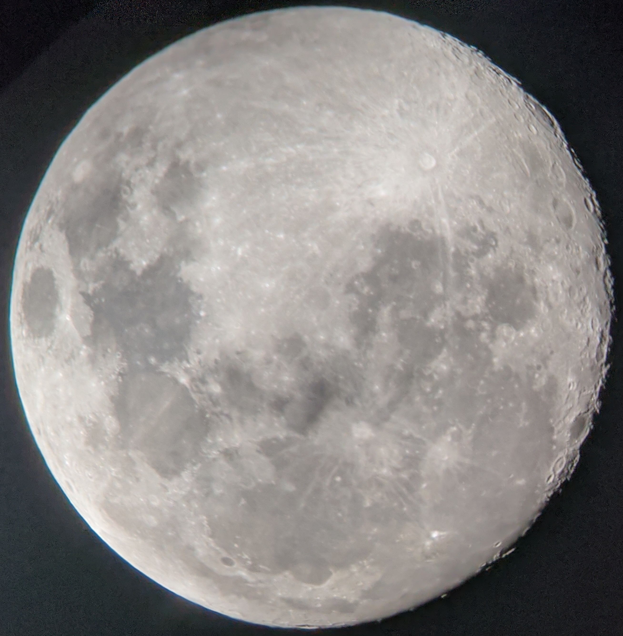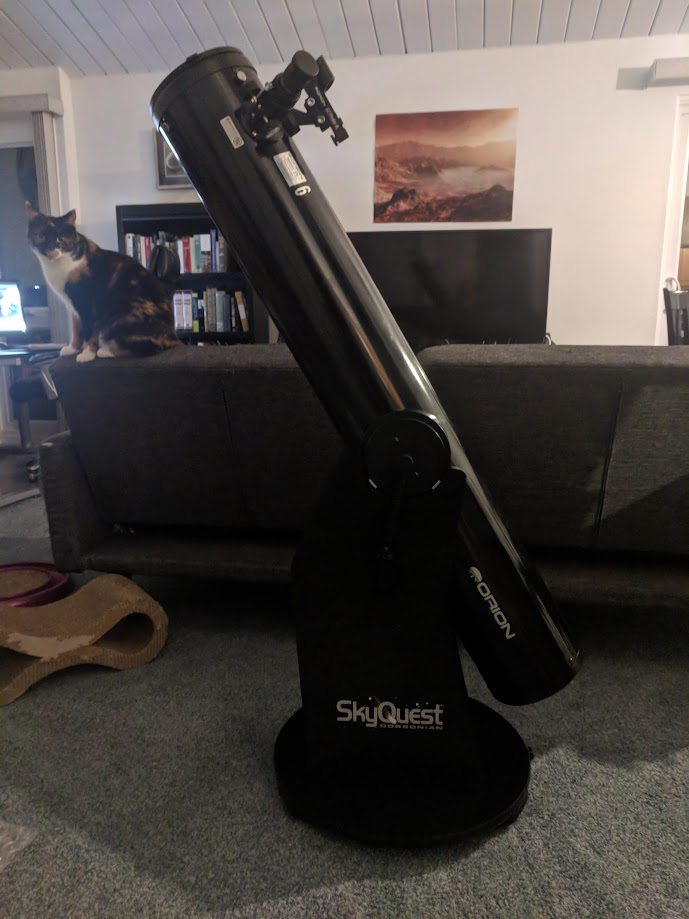 The other fun approach involved my backyard telescope, a SkyQuest XT8 shown below with a cat for scale. The thing was a beast: it's just a huge metal tube, held up by a chunk of wood and some terrifying metal springs. At the time it was the most aperture you could get for a few hundred bucks. As a PhD student I couldn't afford any fancy astrophotography equipment (or even a decent camera for that matter), and the telescope was way too heavy for me to easily move even as far as the park behind my house. So I used to just drag the telescope onto the balcony and then hold my android smartphone up to the eyepiece. I was at least able to get some fairly crisp, un-distorted shots of the moon.